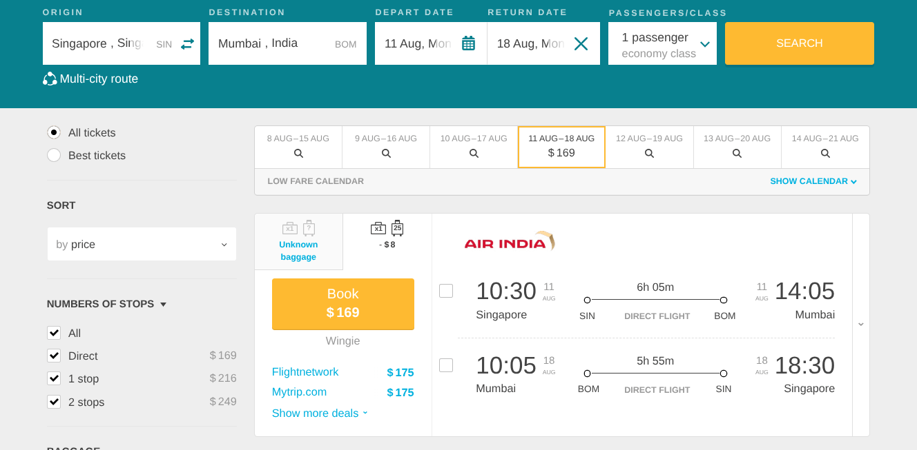 Air India is offering discounted nonstop flights from Singapore to Mumbai, India starting at only US$169 for a round trip!