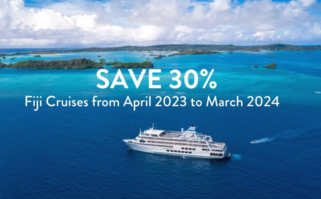 Save 30% off normal prices on 7-night Fiji cruises aboard the stylish 120-passenger Reef Endeavour when you cruise between 01 April 2023 and 31 March 2024.