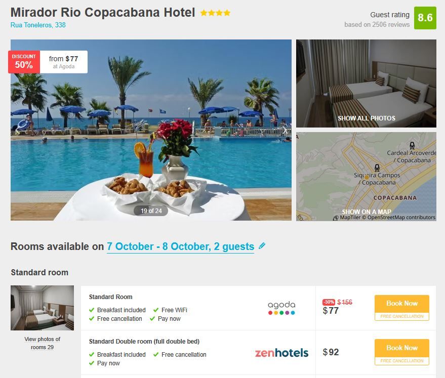 Stay in a double room at the 4* Mirador Rio Copacabana Hotel with excellent reviews and breakfasts included from $77 per night/room (based on 2 people sharing) incl. tax! Also, Breakfast is inclusive! That`s 50% off!