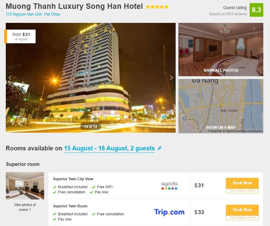Book your stay at this well-rated 5-star Muong Thanh Luxury Song Han Hotel, Da Nang, Vietnam with fabulous reviews for just US$ 31 per room/ night breakfast included, free WiFi & (inclusive of taxes). This is a very good price for a 5-star hotel.