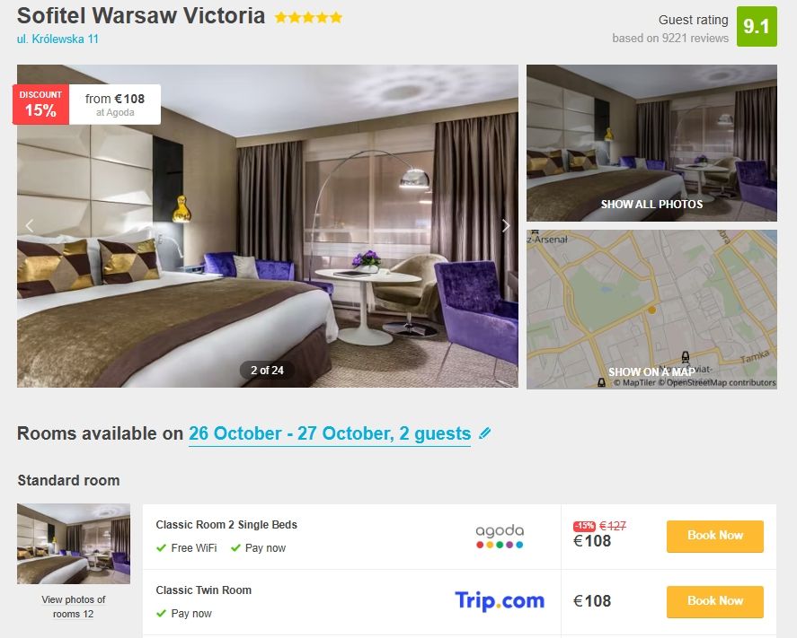 We found a luxury 5-star hotel in Warsaw, Poland for only โฌ108 / night / room (inclusive of taxes).